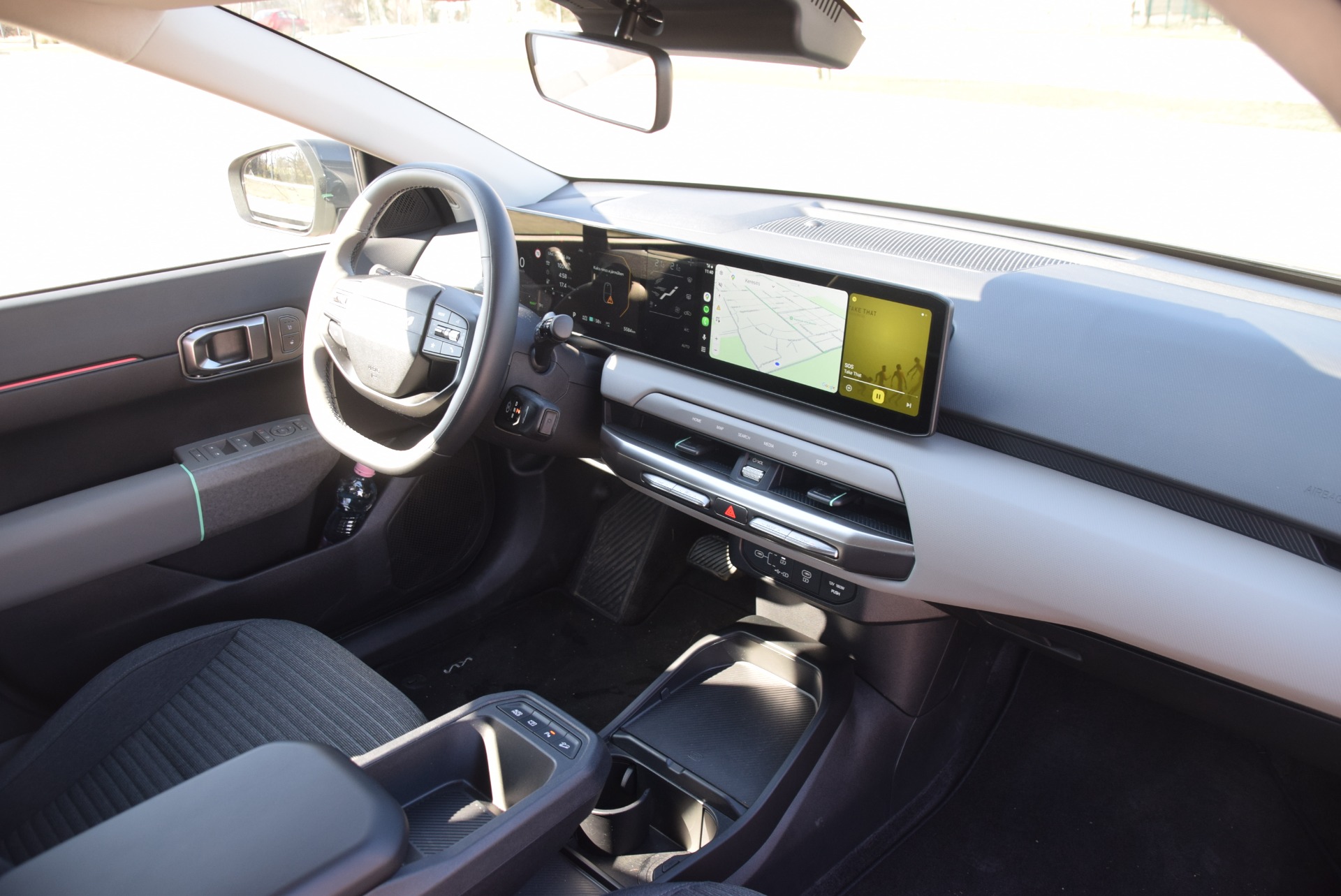 A teszthét során az autó vegyes használatban futott. Városi közlekedés, elővárosi szakaszok és autópálya is szerepelt a programban, a hetet pedig egy Budapest és Komárno közötti oda-vissza úttal zártuk. A végső átlagfogyasztás 13 kWh körül alakult, ami kifejezetten jó eredmény egy ilyen méretű elektromos autónál. Ez a szám azt is jelzi, hogy a hatótáv a hétköznapokban is könnyen kihasználható.