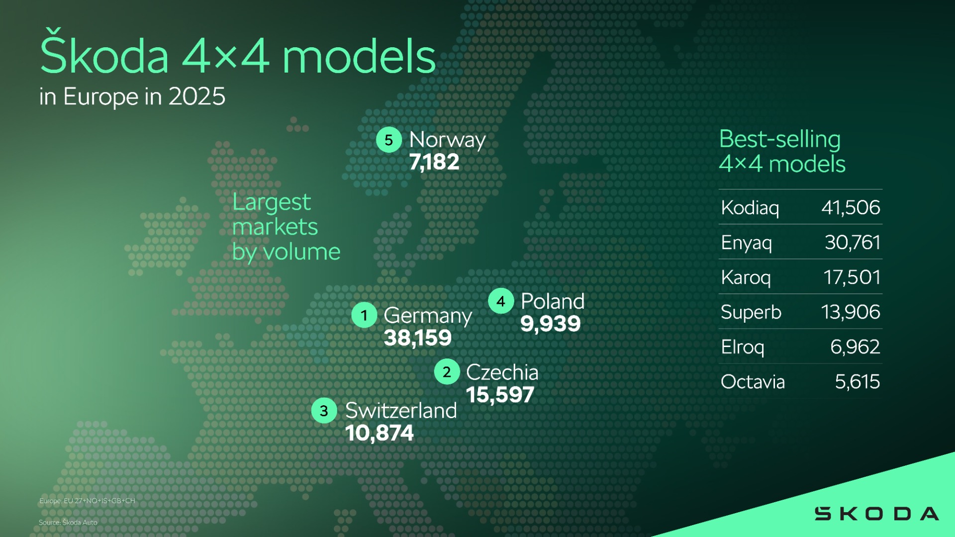 2020 óta a Škoda Auto összesen több mint 110 000 teljesen elektromos, összkerékhajtású járművet szállított ki, amelyek hagyományosan az alpesi és északi piacokon, például Svájcban, Németországban, Norvégiában és Svédországban a legerősebbek. 2025-ben a cseh autógyártó összesen 125 895 összkerékhajtású járművet szállított ki világszerte.